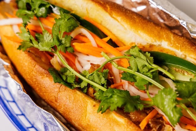 This spot is tiny, fast, and so satisfying—especially if you’re in the mood for something savory and herby that isn’t your usual plate lunch. Their standout is the bo la lot bánh mì: seasoned beef wrapped in betel leaf, grilled, then tucked into a baguette with all the fixings. See more here.